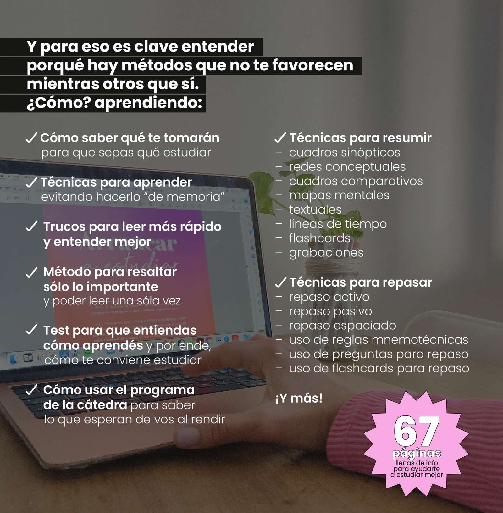 Claramente no, porque si te explicáramos todas las técnicas del mundo sería in fi ni to y creenos, no querrías leerlo ¡ja! y la idea es justamente no sumarte una lectura pendiente más sino una herramienta que te ayude y sume. Por eso en él encontrarás las técnicas que tanto a nosotros como a cientos de estudiantes nos han ayudado a estudiar y aprender mejor. Y ojalá a vos también te ayuden.