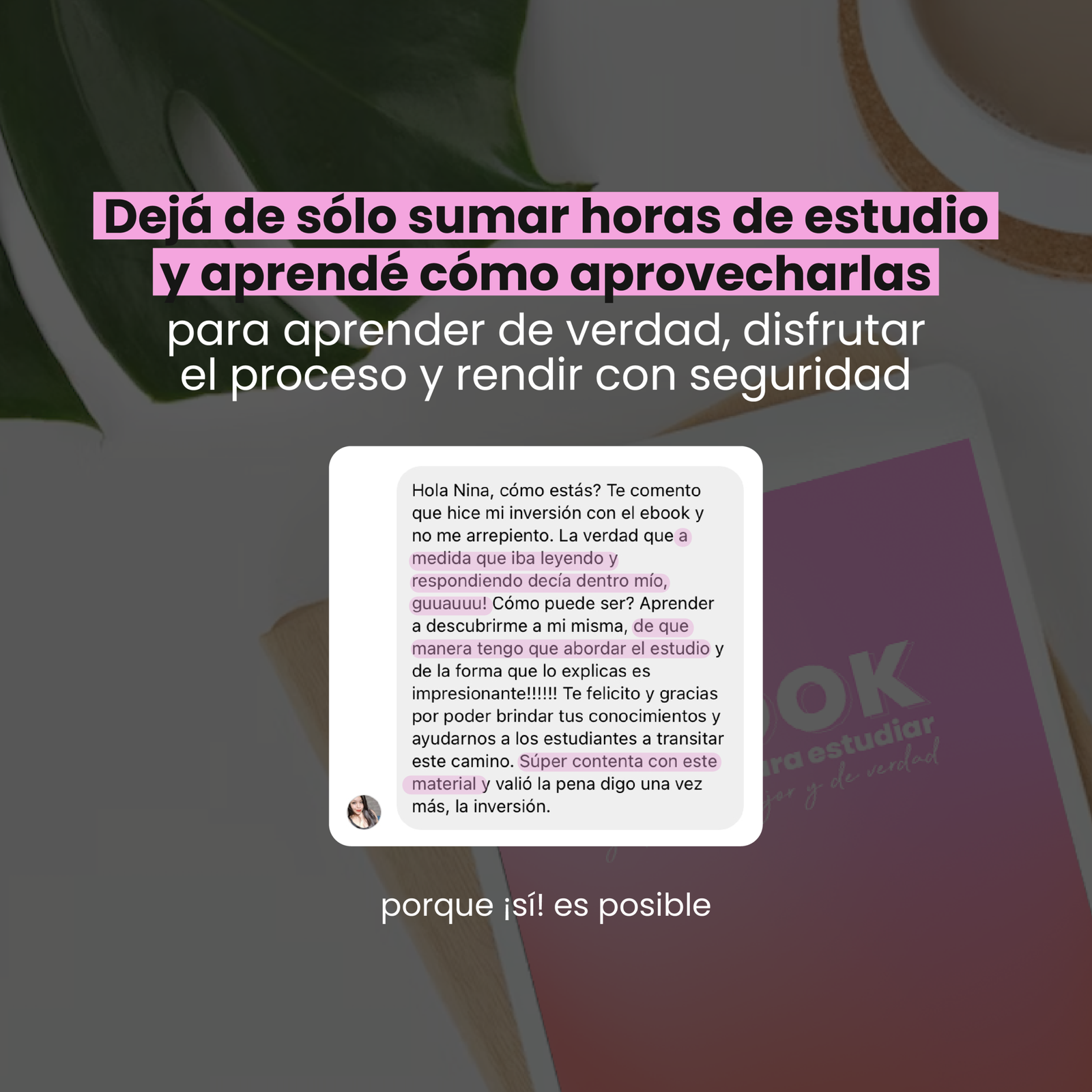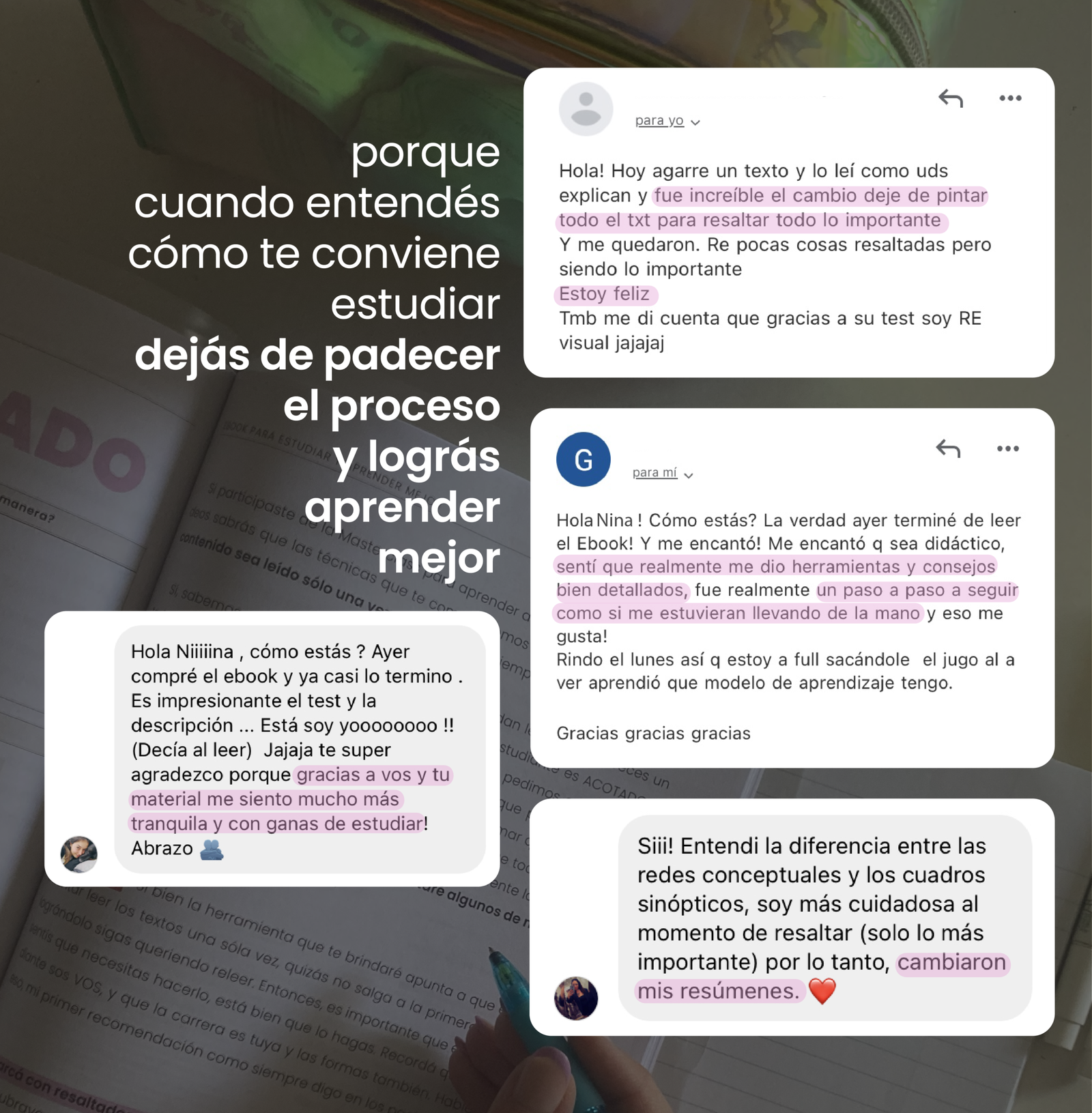 Compré tu ebook, en un rato me lo leí, siento que me ayudo tanto tanto. Y pensaba mientras lo leí 5 años estudiando y nunca jamás supo enseñarme las técnicas de estudio, las diferentes maneras de repaso, nadie supo enseñarme que la frustración es parte del estudiante … nadie me lo mencionó … gracias a tu ebock me siento mucho mejor preparada … ya estoy aplicando las nuevas técnicas ! Y siento que ahora si voy a brillar !!! Gracias de corazón por tomarte el tiempo de hacer todos y cada uno de sus detalles ❤️ te quedo hermoso! Gracias 🫶