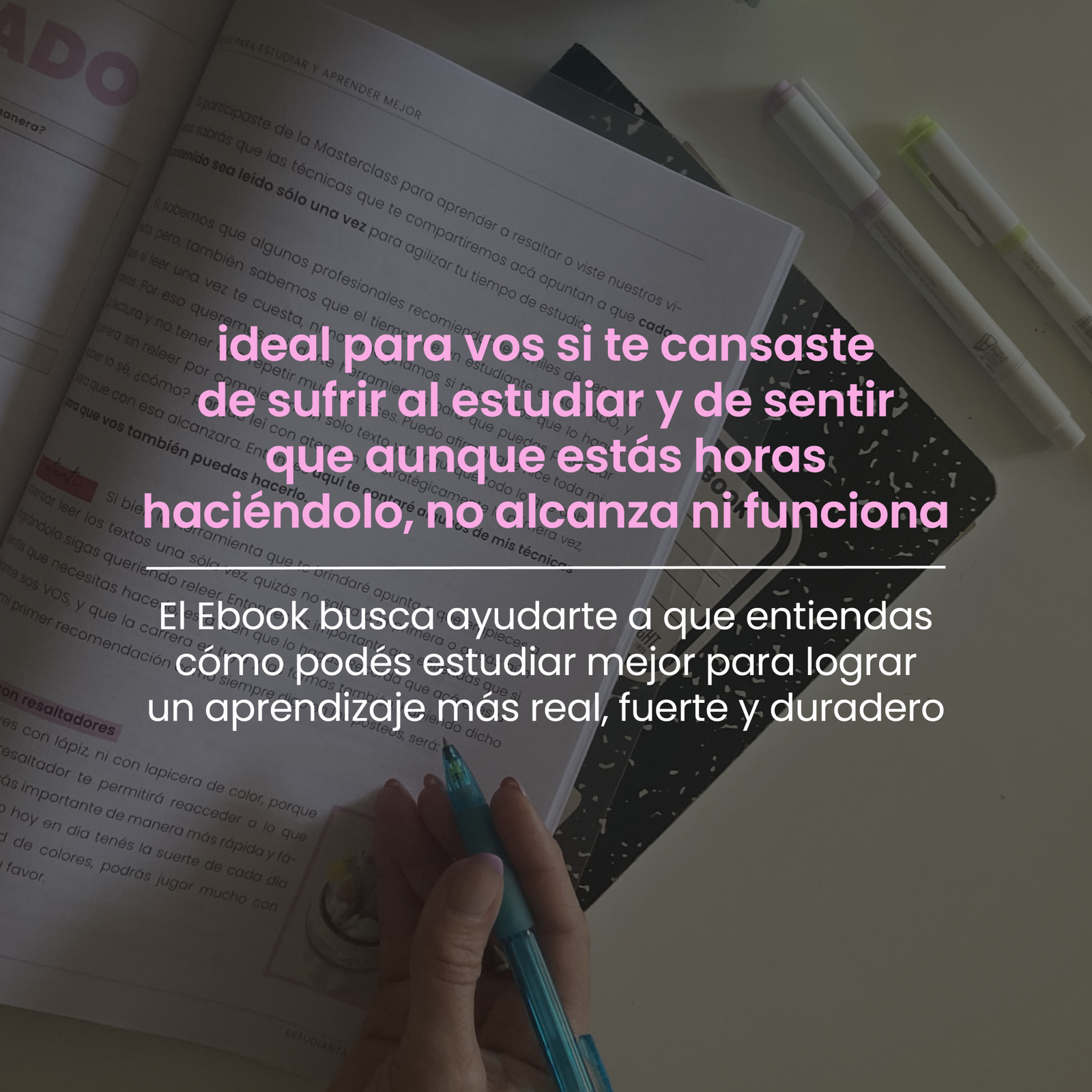 El ebook me sirvió mucho para poder hacer un autoregistro de como funcionó mejor a la hora de estudiar, darme cuenta de que soy muy visual ! Y también pude entender como ahorrar tiempo y hacerlo más eficaz a la hora de resaltar ,pase de “pintar” a resaltar solo aquello que es importante,es increíble como uno a veces por no “perderse” nada termina enrredado resaltando todo y abrumando la cabeza con más contenido en vez de ir a lo importante y puntual que el autor nos quiere decir.