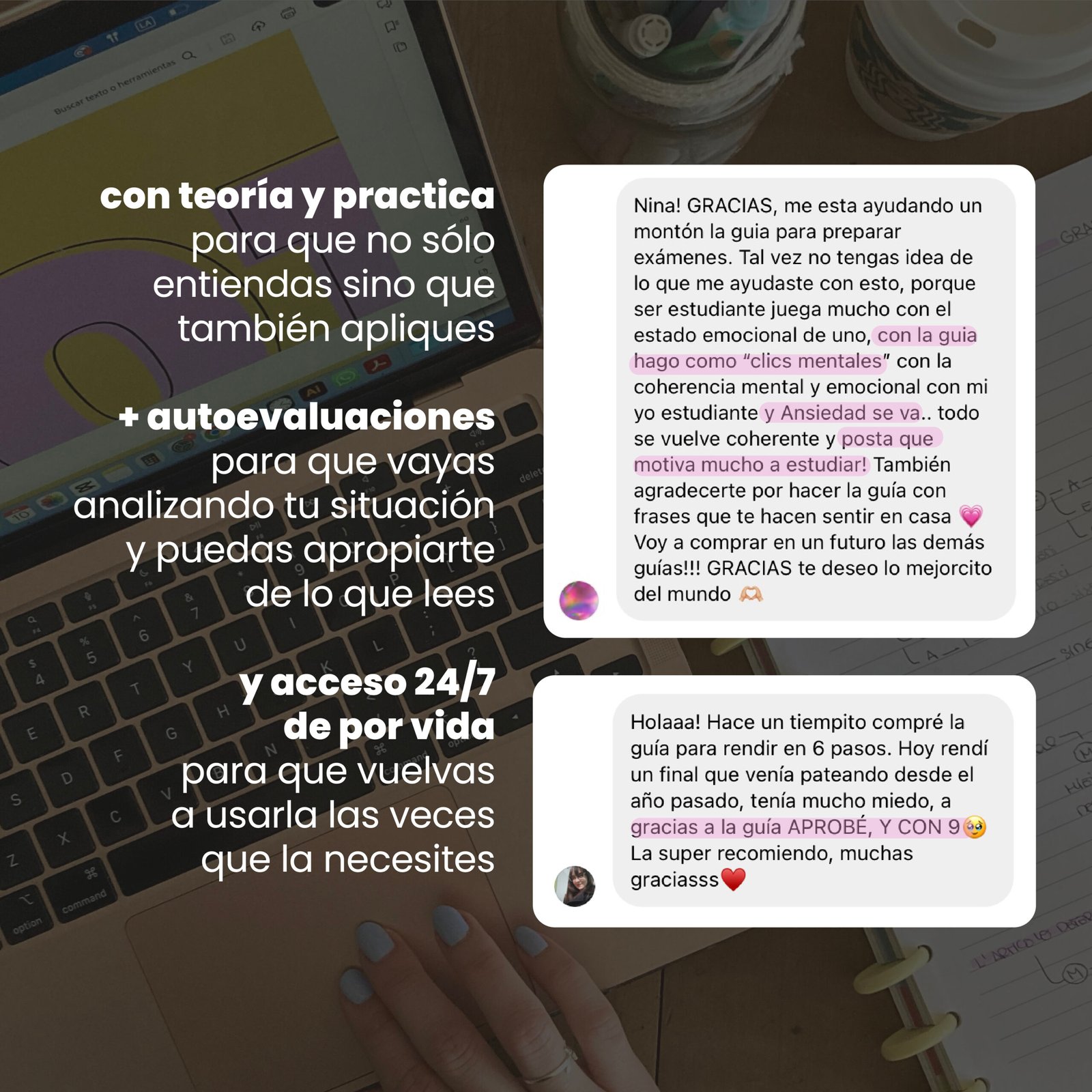 Hola Nina, te sigo hace como dos años creo y compre tus guías en ese tiempo y aprendí mucho de tu contenido.. me sirvió mucho para darme cuenta qué cosas cambiar, que cosas eran normales. Ni hablar de que me marcó un camino para ser la estudiante que realmente quiero ser y por eso lo recomiendo siempre. Dejar de sufrir la carrera y empezar a disfrutarla es lo que debería ser normal. 🤍🤍 Graciassss