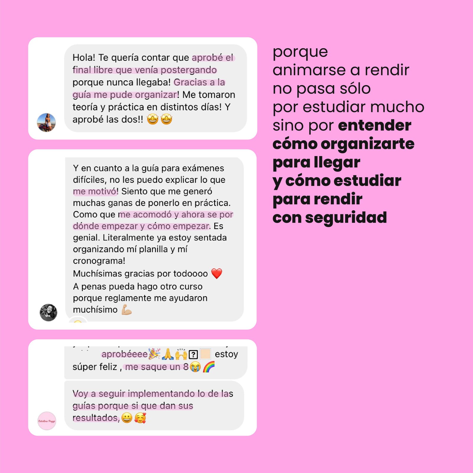 Cuando adquirí esta guía, estaba desganada con la carrera y muy frustrada porque cada vez que rendía me iba mal… Estudiaba mal y está guía fue una guía justamente para organizarme con los tiempos y aprobar y de a poco, volver a tener confianza en rendir con nuevos hábitos! Gracias Nina y al equipo!